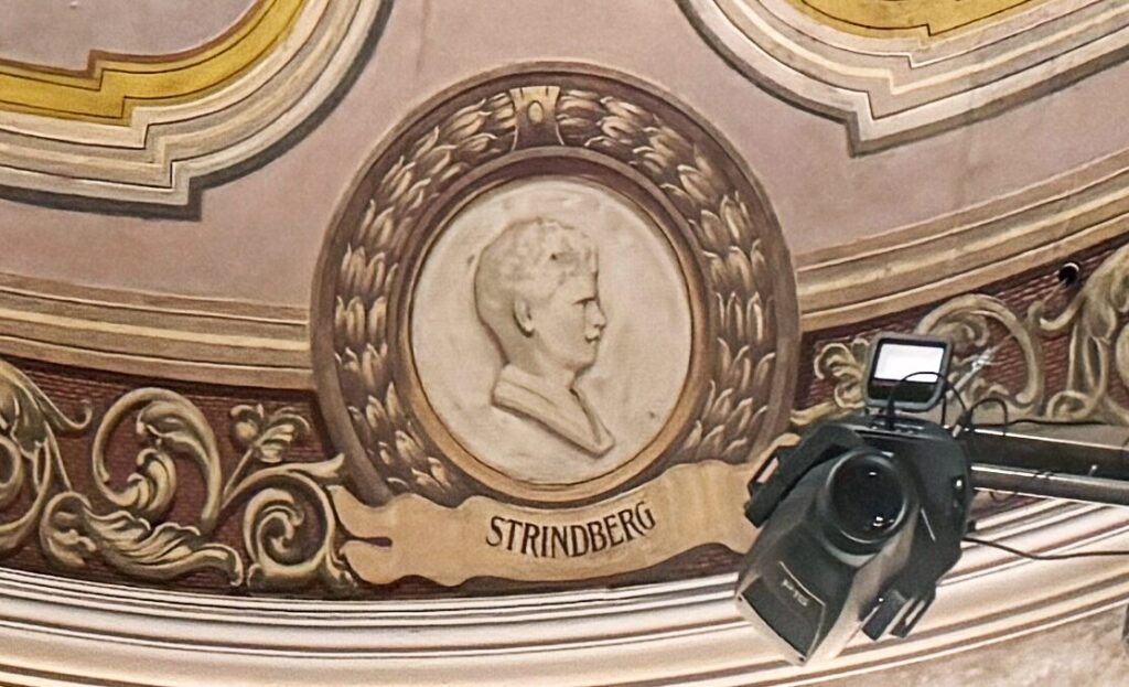 Om du tittar uppåt i taket på Stora scenen salong ser du en relief av August Strindberg tillsammans med Shakespeare, Moliére, Ibsen, Goethe, Schiller, Calderon, Oelenschläger, Holberg, Topelius och Runeberg.